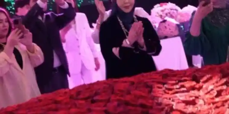 “Айнұр ханымға жолдасы келе алмаса да Ыстамбұлдан беріп жіберді. 1001 раушан гүлін ортаға әкелейік”, – деді той жүргізушісі.