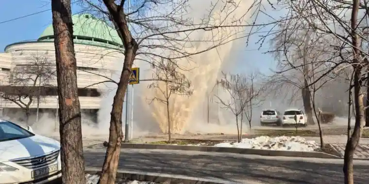 Алматыда құбыр жарылып, жерден ыстық су атқылады. Жарылыс Төлебаев пен Әйтеке би көшелерінің қиылысында болған, деп жазды Zakon.kz.