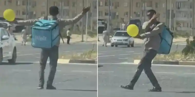 Курьер қолына фирмалық жеткізу сөмкесін және сары түсті әуе шарын ұстап, жолға шығып, көлік ағынын «реттей» бастаған.