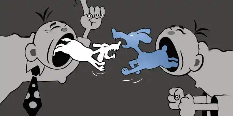 Бірінші сурет әлемге аты әйгілі қазақ карикатурашысы Ғалым Смағұлұлының алғашқы туындыларының бірі. Екі адам қарама-қарсы тұрып алған. Ауыздарынан «ақ ит кіріп, көк ит шығып» жатыр. Көріп тұрсыздар, сөзсіз. Сурет. Оны тек визуалдық тұрғыда ұғуыңыз керек. Ал, енді айтыңыздаршы, «аузынан ақ ит кіріп, көк ит шығады» деген қазақтың тұрақты сөз тіркесін білмейтін, оның мағынасын түсінбейтін адам мұндай сурет сала ала ма? Әрине, сала алмайды. Бірақ, екі адамның ұрысып жатқанын, қоғамдық орында бір келеңсіздіктің болып жатқанын кез-кеген жұрт өкілі бейнелік тұрғыда түйсіне алады, бірақ өз жанынан шығара алмайды. Суретші қазақтың тілі арқылы жеткен пайым-түсінік, бағасын пішін-форма ретінде қолданып тұр. Тіл – ұлттың таным кілті дегеніміз – осы.