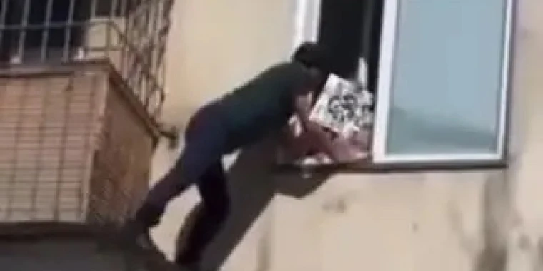 Ер адам бірінші қабаттағы темір тор арқылы жоғары өрмелеп, екінші қабаттың балконына шыққан. Кейін терезеге жақындап, баланың ата-анасын дауыстап шақырған.