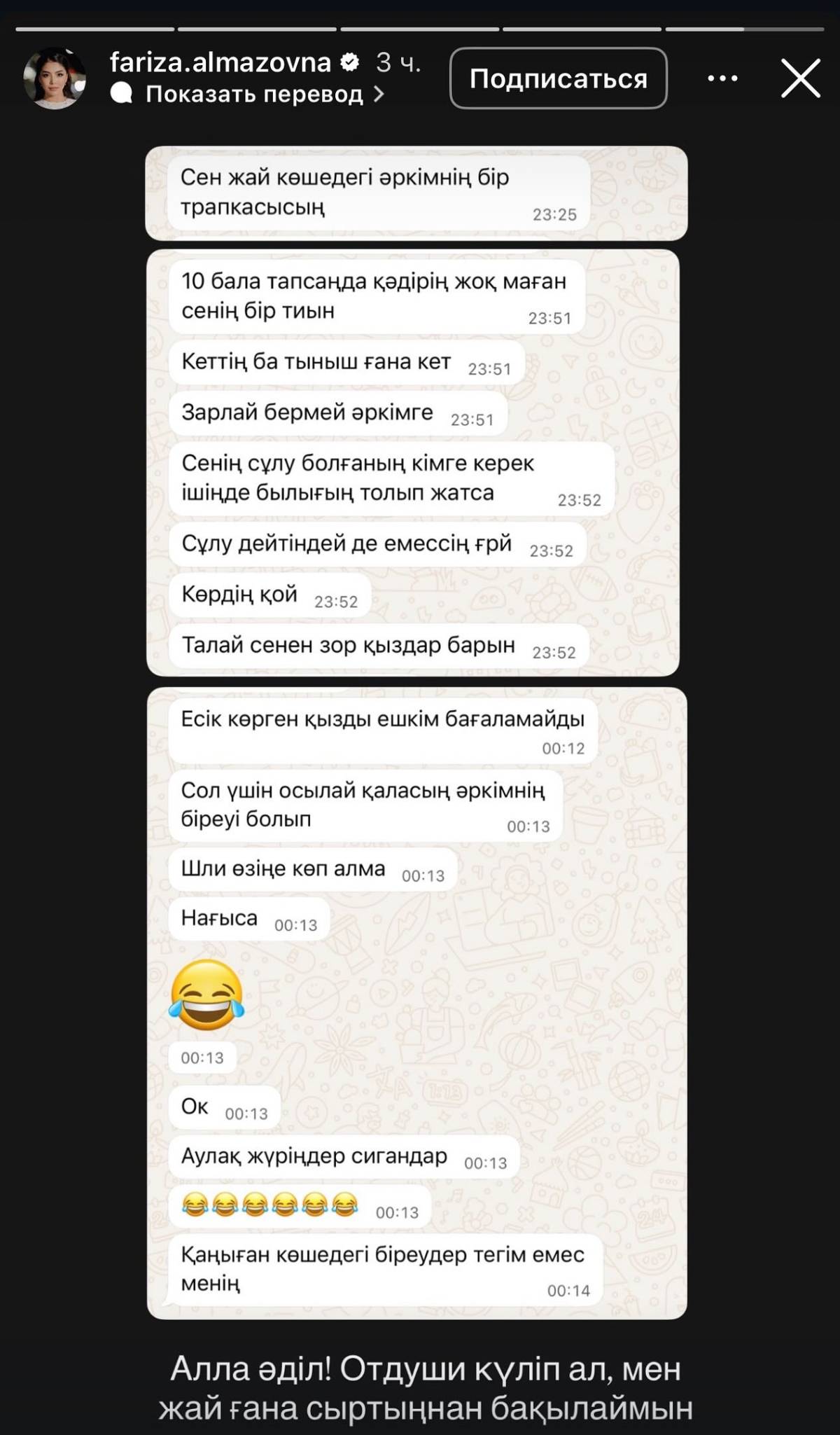 "Өміріңді тыныш сүр, менің саған қатысым жоқ. Мен Аллаға шүкір, өз жағдайыммен жүрмін. Жұмыс істеп, үйіңді асыра. Менен алатыныңды әлдеқашан алғансың. Зарлай бермей, тірлігіңді жаса. Сенің сұлулығың кімге керек, ішкі әлемің лас болса. Талай сенен сұлу, ақылды қыздар бар. Сондықтан әркімнің өміріне килікпей, өз жолыңмен кет", – деп жазған Нұрсұлтан Жақсыген.