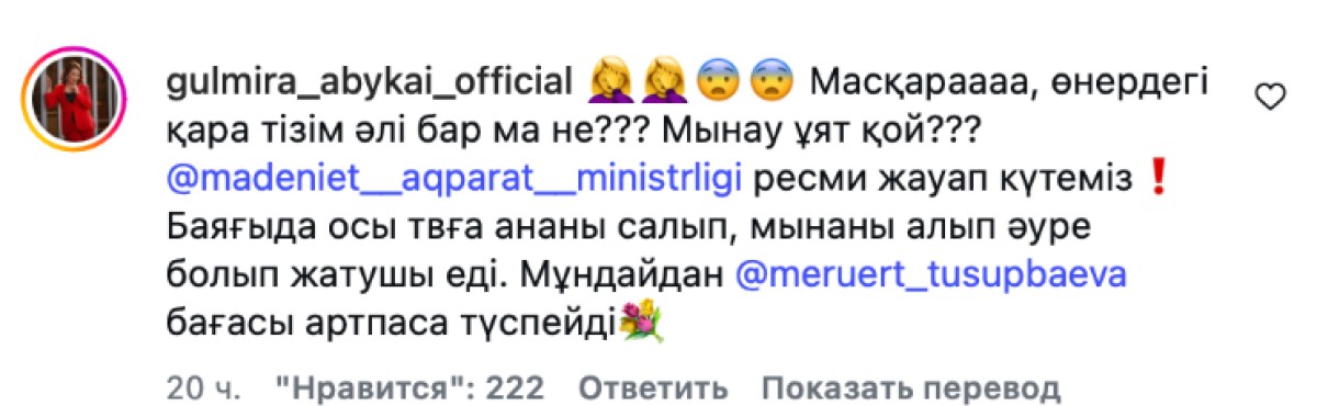 «Масқара, өнердегі қара тізім әлі бар ма не? Мынау ұят қой? Мәдениет және ақпарат министрлігі, ресми жауап күтеміз. Баяғыда осы тв-ға ананы салып, мынаны алып әуре болып жатушы еді. Мұндайдан Меруерт Түсіпбаева бағасы артпаса түспейді», — деп пікір білдірді ол.