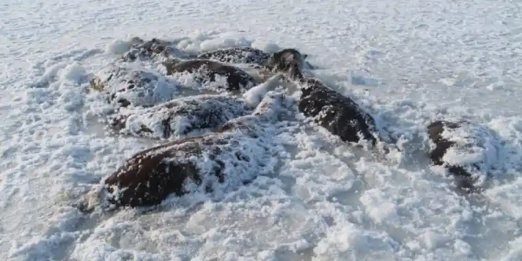Павлодар облысындағы көлдердің бірінен мұз болып қатып қалған 26 жылқы табылды.