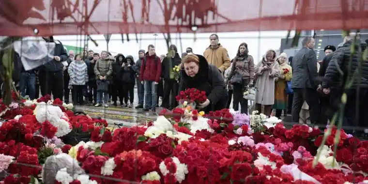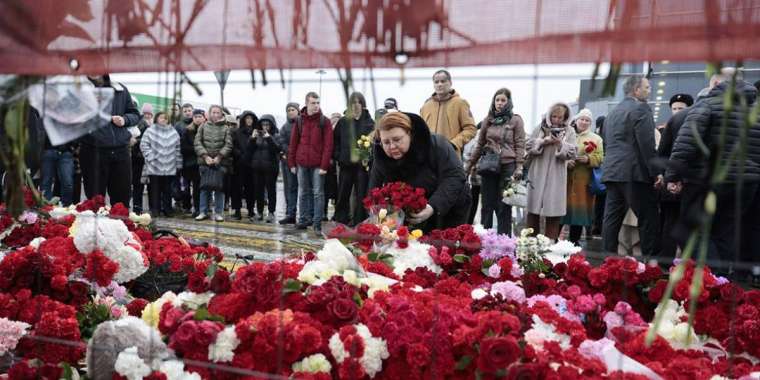 Жұрт теракт болған «Крокус Сити Холл» концерт залы алдына гүл шоқтарын қойып, шырақ жағып жатыр.