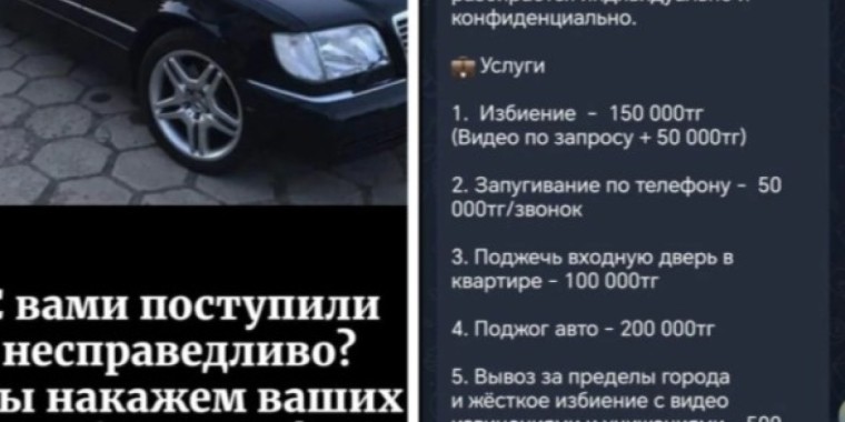 Қазақстандық Telegram арналарында ақшаға "жазалау қызметін" ұсынатын күмәнді хабарландыру тарады. Белгісіз тұлғалар қорқыту, ұрып-соғу және мүлікті өртеу секілді заңсыз әрекеттерді ақылы түрде орындауға дайын екенін мәлімдеген. Бұл туралы Malim.kz Tengrinews.kz сайтына сілтеме жасап хабарлайды.