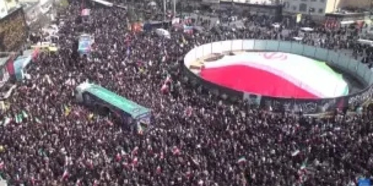 Иран туына оралған табыттар Тегеранның орталық көшелерімен жүк көліктерімен жеткізілді, ал қара жамылған жұрт қолдарына портреттер мен кек алуға шақырған плакаттарды ұстап тұрды.