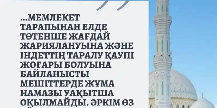 Біріншіден, мемлекет тарапынан елде төтенше жағдай жариялануына және індеттің таралу қаупі жоғары болуына байланысты мешіттерде жұма намазы уақытша оқылмайды. Әркім өз үйінде жұма намаздың орнына бесін намазын өтейді.