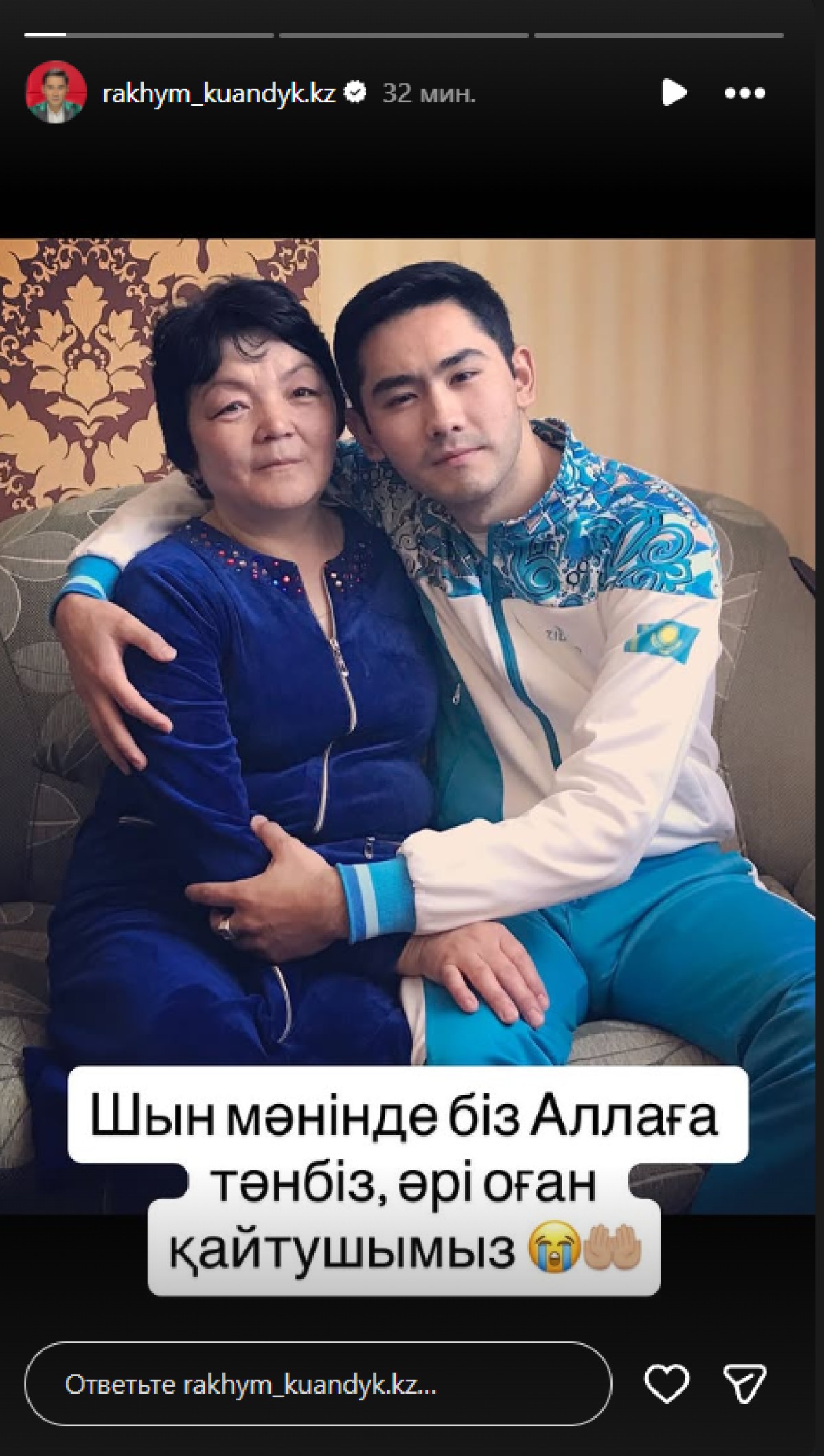 Сондай-ақ Қуандық Рахым тағы бір жазбасында өмірдің өткіншілігі туралы ой қозғап, "Шын мәнінде біз Аллаға тәнбіз әрі оған қайтушымыз" деп, ауыр қайғысын бөлісті.